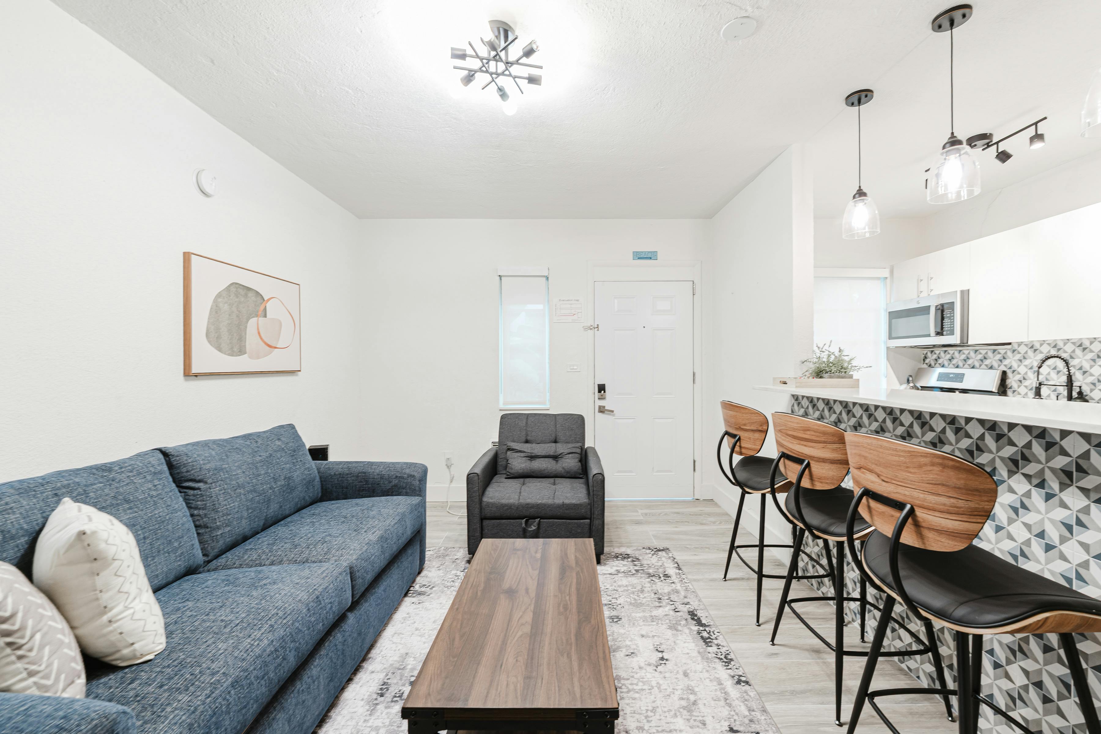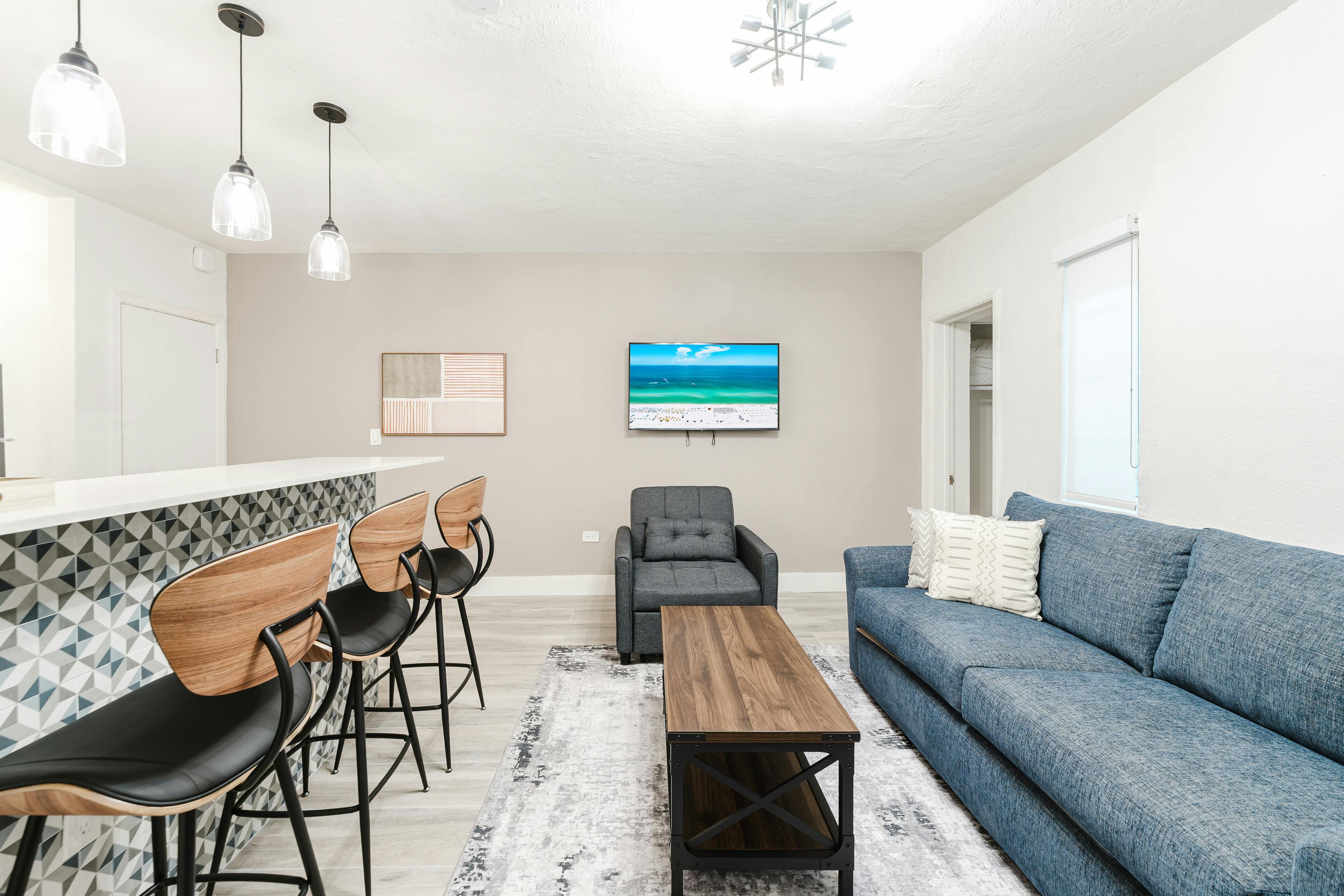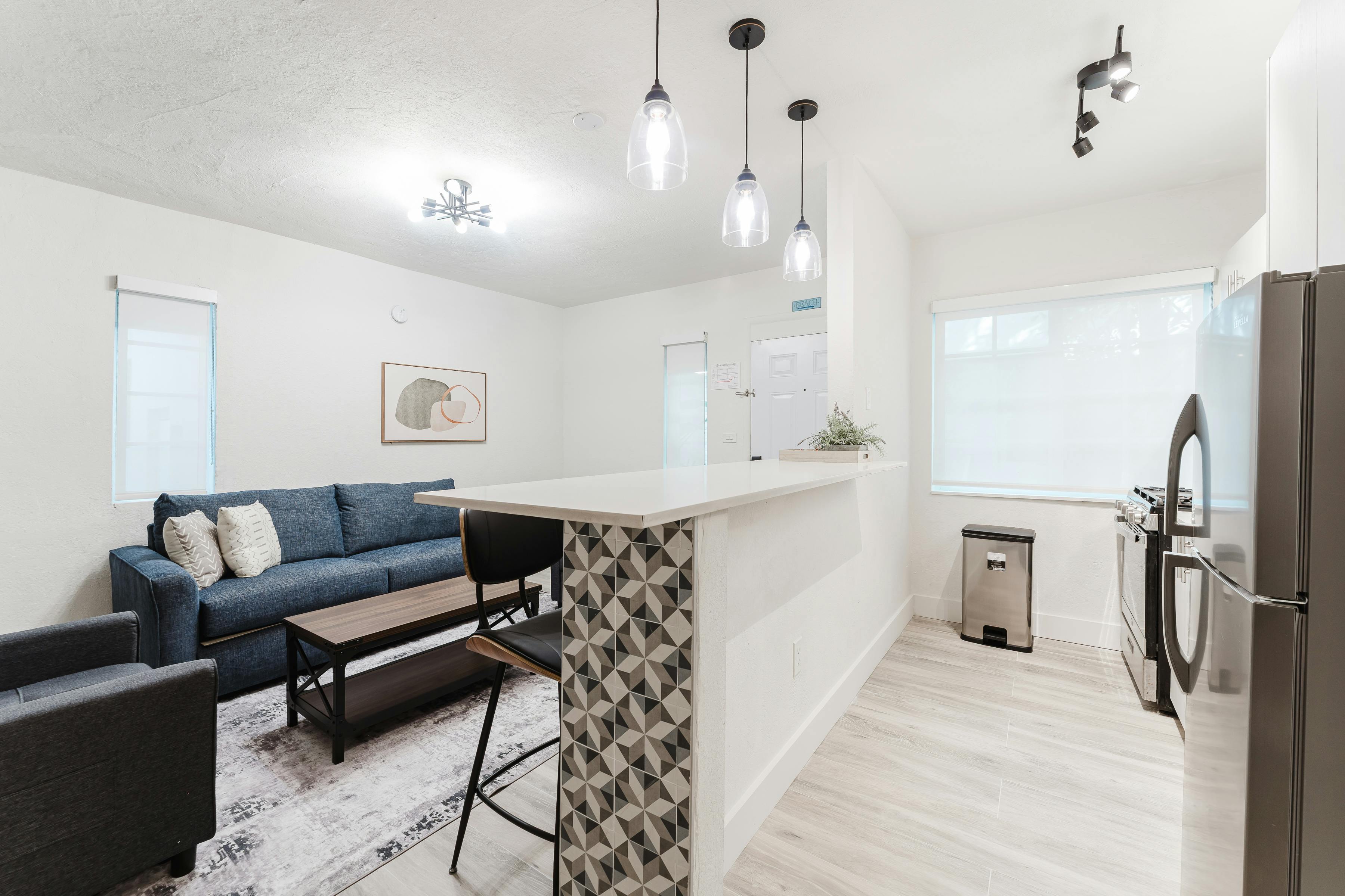 Enjoy a relaxing stay in our modern, fully equipped 1BR apartment near Miami Beach. It features a cozy living area, open kitchen, smart TVs, A/C units, luxury shower, free Wi-Fi, and beach essentials. Ideal for families and groups. All 1BR units share the same layout; décor colors may vary, and more amenities.